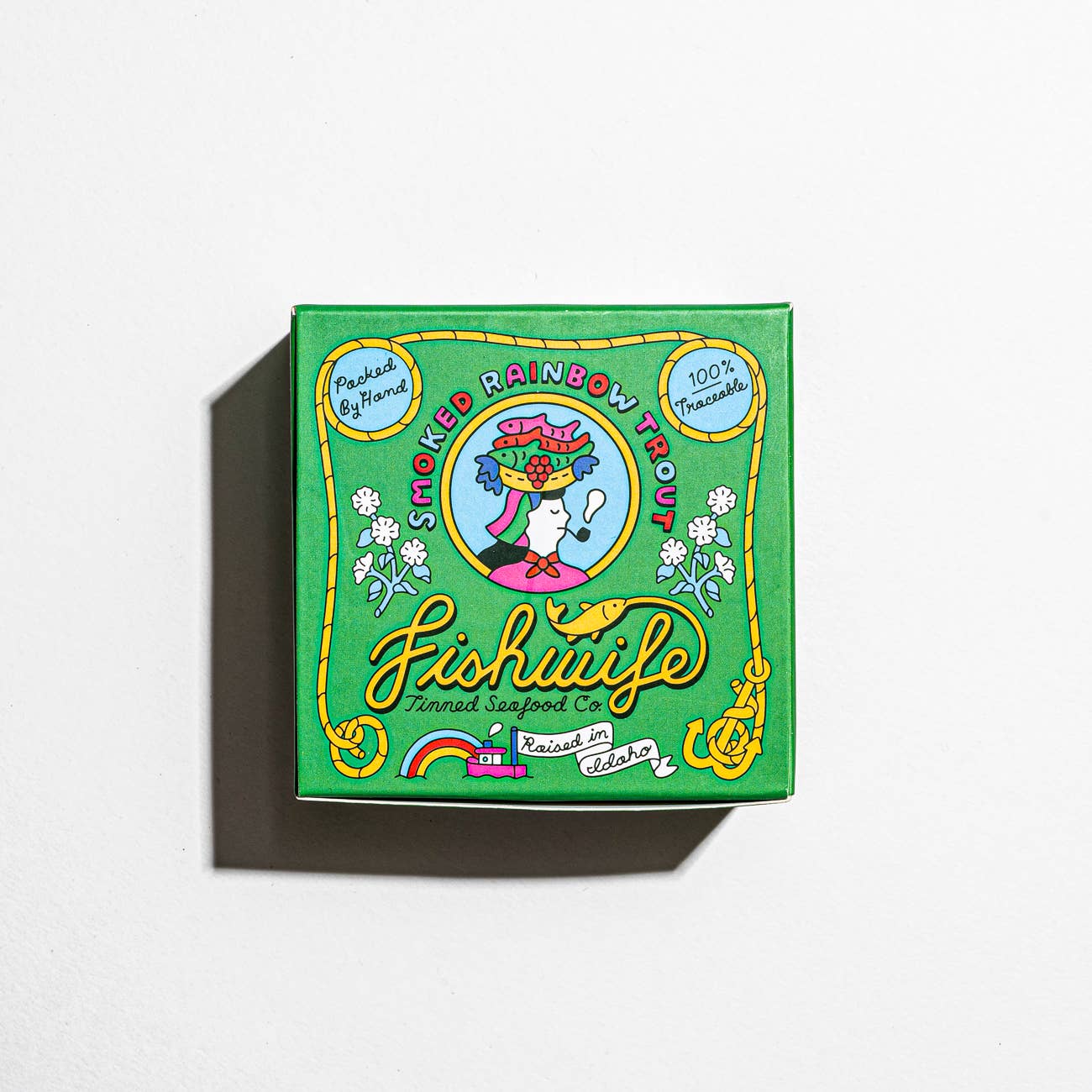 🌈🐟 The trout is brined in salt, garlic, onion, and cane sugar, smoked in small batches over alder wood, hand-packed with extra virgin olive oil, and canned by a family-owned cannery on the coast of Washington.